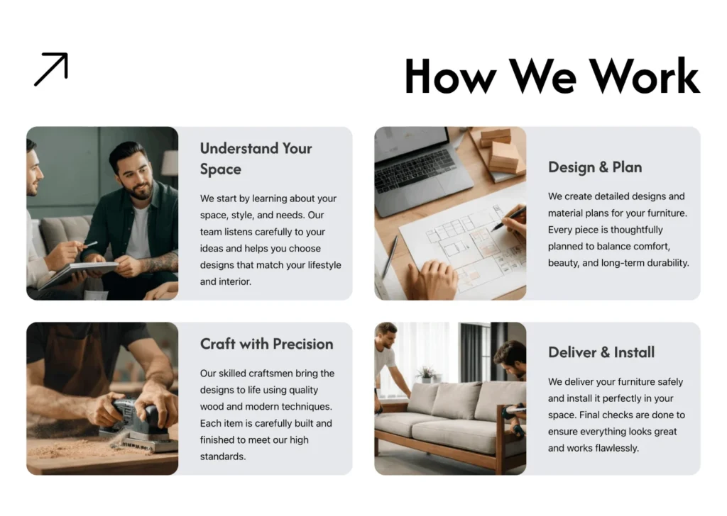 {"id":6096,"name":"furntiure-cards-section","title":"Furntiure Cards Section","date":"2026-02-13 15:03:54","date_formatted":"February 13, 2026","author":{"name":"AK_Developer_25","avatar":"https:\/\/secure.gravatar.com\/avatar\/4895fa216fc2f1ee16e6575899e50eb2388264a879a9791a3ad02c7bed840715?s=60&d=mm&r=g","url":"https:\/\/gallopbiz.in\/ak-dev"},"permalink":"https:\/\/gallopbiz.in\/ak-dev\/template\/furntiure-cards-section\/","thumbnail":null,"bundles":[],"tags":[],"type":"section","content":[{"id":"ce95a8","name":"section","parent":0,"children":["c6241c","9cc9bb"],"settings":{"_cssGlobalClasses":["zmcijy","foxuge"],"_padding":{"top":"0"},"_rowGap":"40","_columnGap":"40","_padding:mobile_landscape":{"top":"20"}},"label":"Furntiure Cards Section"},{"id":"c6241c","name":"container","parent":"ce95a8","children":["4c712e","39aa6f"],"settings":{"_cssGlobalClasses":["oorplp","qtbpnb"],"_columnGap":"20","_justifyContent":"space-between"}},{"id":"4c712e","name":"svg","parent":"c6241c","children":[],"settings":{"file":{"id":1256,"filename":"Icon.svg","url":"https:\/\/gallopbiz.in\/ak-dev\/wp-content\/uploads\/2025\/06\/Icon.svg"},"_cssGlobalClasses":["qcldy1"],"stroke":{"hex":"#000000","id":"ymdprl","name":"Color #2"},"link":{"type":"external","url":"#"}},"label":"Svg","themeStyles":[]},{"id":"39aa6f","name":"heading","parent":"c6241c","children":[],"settings":{"text":"How We work","tag":"h2","_cssGlobalClasses":["gowwxl"]}},{"id":"9cc9bb","name":"container","parent":"ce95a8","children":["117469","a3daf0","2e938e","50ca95"],"settings":{"_cssGlobalClasses":["oorplp","pbbhko"],"_rowGap":"40"}},{"id":"117469","name":"block","parent":"9cc9bb","children":["684ca3","e4029d"],"settings":{"_cssGlobalClasses":["qdskul"],"_direction":"row"}},{"id":"684ca3","name":"block","parent":"117469","children":[],"settings":{"_cssGlobalClasses":["sxstgp"],"_background":{"image":{"id":6070,"filename":"step-1.webp","size":"full","full":"https:\/\/gallopbiz.in\/ak-dev\/wp-content\/uploads\/2026\/02\/step-1.webp","url":"https:\/\/gallopbiz.in\/ak-dev\/wp-content\/uploads\/2026\/02\/step-1.webp"},"position":"center center"}}},{"id":"e4029d","name":"block","parent":"117469","children":["6d7cec","d20162"],"settings":{"_cssGlobalClasses":["plulxa"]}},{"id":"6d7cec","name":"heading","parent":"e4029d","children":[],"settings":{"text":"Understand Your Space","_cssGlobalClasses":["mngdzh"]}},{"id":"d20162","name":"text-basic","parent":"e4029d","children":[],"settings":{"text":"We start by learning about your space, style, and needs. Our team listens carefully to your ideas and helps you choose designs that match your lifestyle and interior.","_cssGlobalClasses":["cufdzw"]}},{"id":"a3daf0","name":"block","parent":"9cc9bb","children":["0a75db","4688b6"],"settings":{"_cssGlobalClasses":["qdskul"],"_direction":"row"}},{"id":"0a75db","name":"block","parent":"a3daf0","children":[],"settings":{"_cssGlobalClasses":["sxstgp"],"_background":{"image":{"id":6072,"filename":"Step-2.webp","size":"full","full":"https:\/\/gallopbiz.in\/ak-dev\/wp-content\/uploads\/2026\/02\/Step-2.webp","url":"https:\/\/gallopbiz.in\/ak-dev\/wp-content\/uploads\/2026\/02\/Step-2.webp"},"position":"center center"}}},{"id":"4688b6","name":"block","parent":"a3daf0","children":["85e27b","340ab6"],"settings":{"_cssGlobalClasses":["plulxa"]}},{"id":"85e27b","name":"heading","parent":"4688b6","children":[],"settings":{"text":"Design & Plan","_cssGlobalClasses":["mngdzh"]}},{"id":"340ab6","name":"text-basic","parent":"4688b6","children":[],"settings":{"text":"We create detailed designs and material plans for your furniture. Every piece is thoughtfully planned to balance comfort, beauty, and long-term durability.","_cssGlobalClasses":["cufdzw"]}},{"id":"2e938e","name":"block","parent":"9cc9bb","children":["bb2888","025821"],"settings":{"_cssGlobalClasses":["qdskul"],"_direction":"row"}},{"id":"bb2888","name":"block","parent":"2e938e","children":[],"settings":{"_cssGlobalClasses":["sxstgp"],"_background":{"image":{"id":6073,"filename":"Step-3.webp","size":"full","full":"https:\/\/gallopbiz.in\/ak-dev\/wp-content\/uploads\/2026\/02\/Step-3.webp","url":"https:\/\/gallopbiz.in\/ak-dev\/wp-content\/uploads\/2026\/02\/Step-3.webp"},"position":"center center"}}},{"id":"025821","name":"block","parent":"2e938e","children":["ff953c","d2c0c5"],"settings":{"_cssGlobalClasses":["plulxa"]}},{"id":"ff953c","name":"heading","parent":"025821","children":[],"settings":{"text":"Craft with Precision","_cssGlobalClasses":["mngdzh"]}},{"id":"d2c0c5","name":"text-basic","parent":"025821","children":[],"settings":{"text":"Our skilled craftsmen bring the designs to life using quality wood and modern techniques. Each item is carefully built and finished to meet our high standards.","_cssGlobalClasses":["cufdzw"]}},{"id":"50ca95","name":"block","parent":"9cc9bb","children":["9a5ba4","aeb30a"],"settings":{"_cssGlobalClasses":["qdskul"],"_direction":"row"}},{"id":"9a5ba4","name":"block","parent":"50ca95","children":[],"settings":{"_cssGlobalClasses":["sxstgp"],"_background":{"image":{"id":6074,"filename":"Step-4.webp","size":"full","full":"https:\/\/gallopbiz.in\/ak-dev\/wp-content\/uploads\/2026\/02\/Step-4.webp","url":"https:\/\/gallopbiz.in\/ak-dev\/wp-content\/uploads\/2026\/02\/Step-4.webp"},"position":"center center"}}},{"id":"aeb30a","name":"block","parent":"50ca95","children":["466432","aaaaec"],"settings":{"_cssGlobalClasses":["plulxa"]}},{"id":"466432","name":"heading","parent":"aeb30a","children":[],"settings":{"text":"Deliver & Install","_cssGlobalClasses":["mngdzh"]}},{"id":"aaaaec","name":"text-basic","parent":"aeb30a","children":[],"settings":{"text":"We deliver your furniture safely and install it perfectly in your space. Final checks are done to ensure everything looks great and works flawlessly.","_cssGlobalClasses":["cufdzw"]}}],"templateType":"section","global_classes":[{"id":"qcldy1","name":"furniture_arrow","settings":{"height":"90","width":"90","stroke":{"hex":"#000000"},"_tr